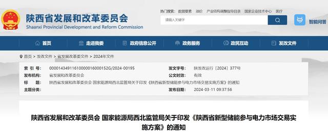 3月11日,陜西省發(fā)展和改革委員會(huì) 國(guó)家能源局西北監(jiān)管局發(fā)布關(guān)于印發(fā)《陜西省新型儲(chǔ)能參與電力市場(chǎng)交易實(shí)施方案》的通知。